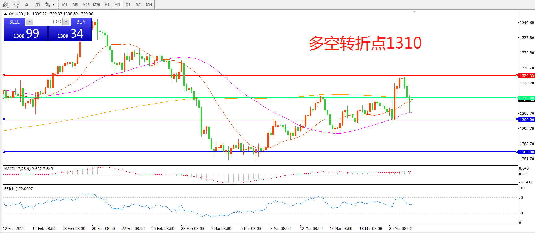 周四(3月21日)美盘时段, 美元指数短线加速上涨近50点,刷新日高至96.63,抹去了美联储决议出炉之后的跌幅,走出U型反转行情。美元急涨,现货黄金则急跌约15美元,跌至1300美元/盎司关口。之后虽重返1310附近,但未能站稳,下方1300关口依然是支撑,日内重点关注1310一线得失。