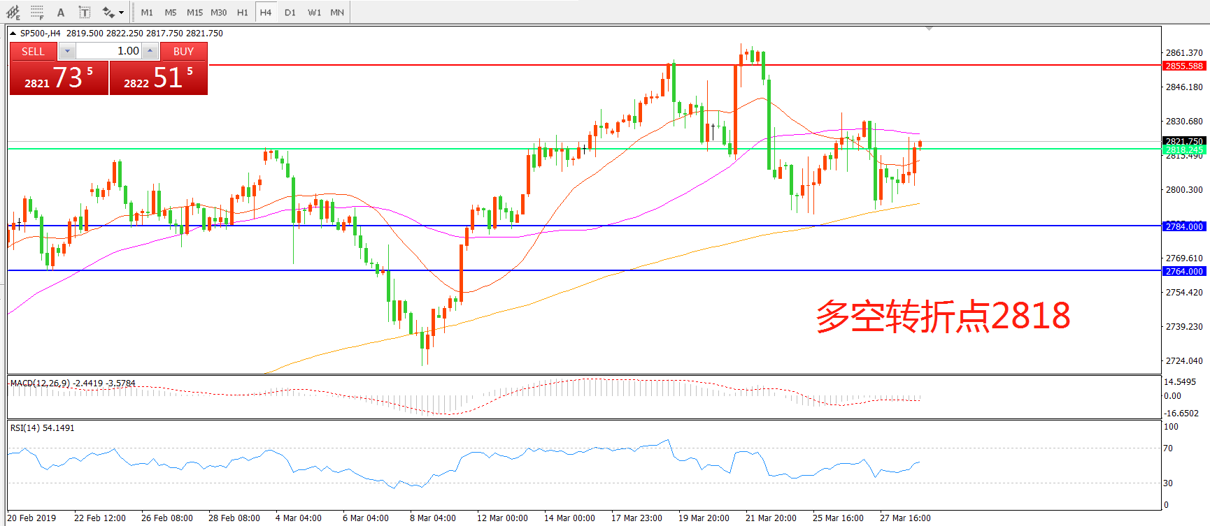 4小时图看,标普500以200均线为依托逐阶上行,走势相对稳健,短期均线向上拐头,MACD红柱增加,RSI拐头向上,日内走势震荡偏多。