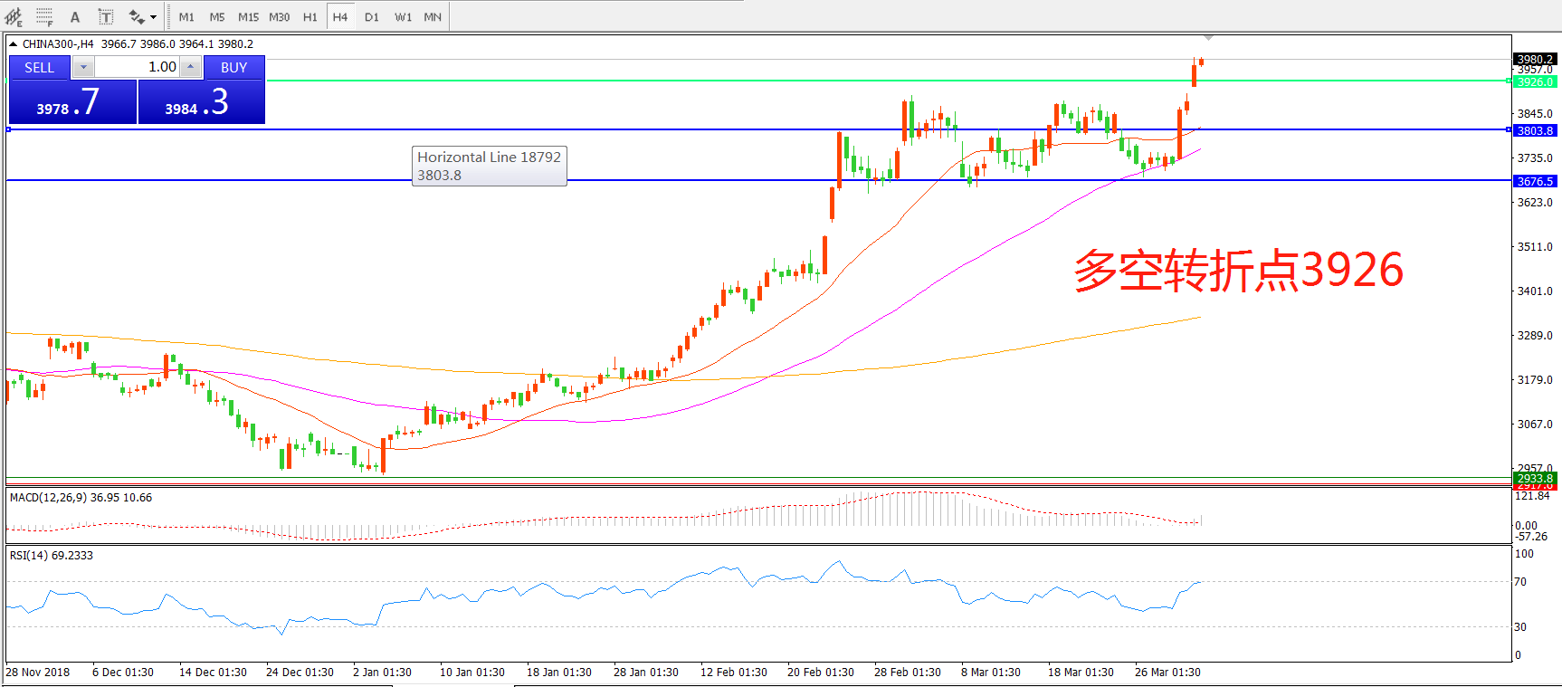 4小时图看,中华指数CHINA300以55均线为依托,强势上行,高开高走,突破前高,整体走势十分强势。 MACD红柱增加,RSI指标拐头向上,多头趋势明显,日内延续上升概率较大。