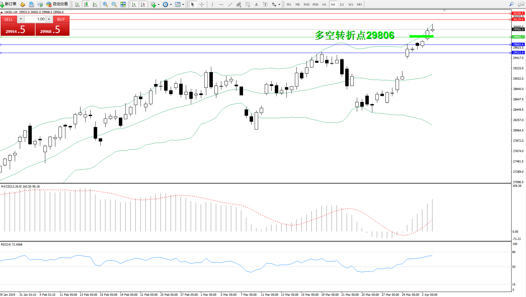 香港恒生指数早盘小幅高开后快速拉升,随后维持高位震荡,截至收盘,恒指涨1.22%,报29986.39点。财新中国3月服务业PMI2月触及的四个月低点51.1升至54.4,创20182月以来新高,并轻松超过分析人士预期的52.3。据中国证监会期货监管部处长焦增军在香港所作报告,中国计划放松对股指期货的限制。计划包括恢复股指期货的正常交易,向外国投资者开放现有的股指期货。
