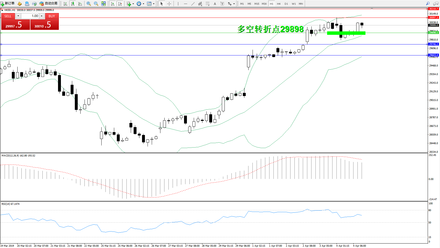 交易策略:29898上方看涨,目标30097、30210