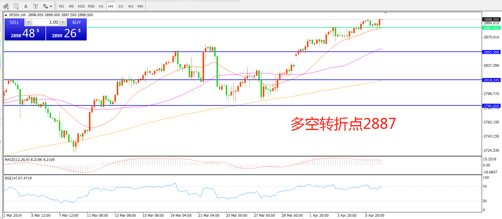 4小时图看,标普500突破上方阻力2887后持续上行,均线系统呈现多头排列, MACD红柱增加,RSI指标走平,日内走势震荡偏多。