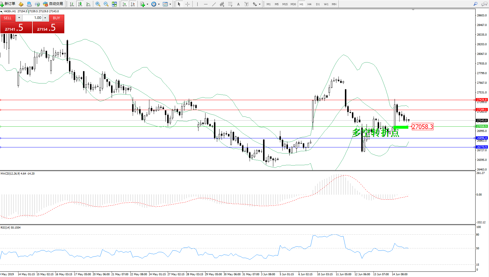 香港恒生指数617日(周一)收盘上涨108.81点,涨幅0.40%,报27227.16点;港股的走势要比A股强,直接是高开,而且早段还有冲高的动作,不过尾市还是没有挺住,这恐怕和A股严重缩量之后市场信心不足有关。沪伦通17日正式启动,中国资本市场双向开放再次迎来大动作。以27300点作为多空的分水岭,今天的尾盘并没有站上这个点位,而且,今天还留下了跳空缺口没有回补,正常情况下,今天这个跳空缺口是要完全回补的,回补之后看恒指在27100点的支撑情况,还是要看消息面的变化。