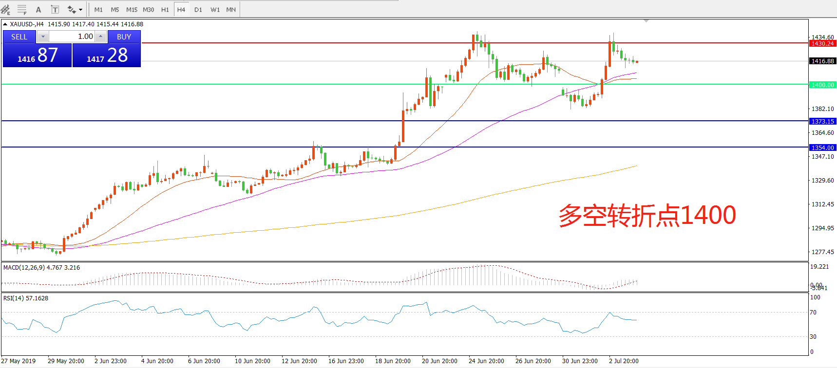 周三(7月3日)在早间金价大幅飙升之后,美盘金价小幅回落,修复早间的强劲升势,最终收报1416.23美元/盎司。美国最新公布的ADP就业人数和ISM非制造业PMI指数均表现不及预期,而本周五又到了美国非农就业数据公布的时间点,鉴于6月7日公布的5月非农数据爆冷远逊于预期、提振金价走高,本周五的非农数据表现至关重要。