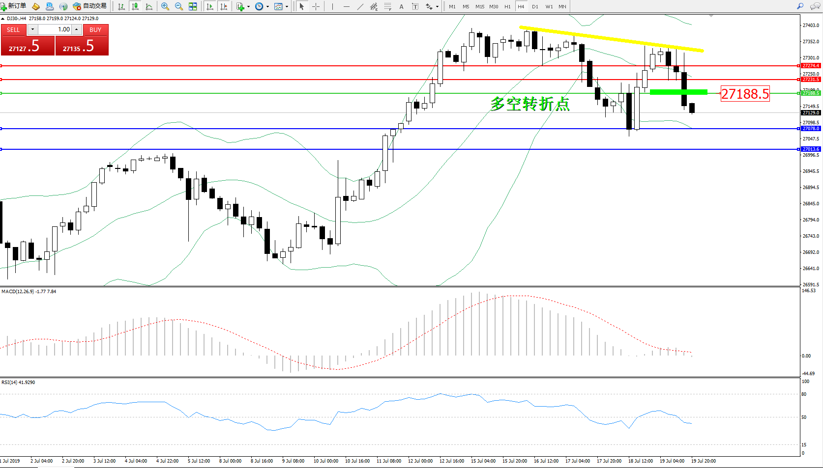 道琼斯指数DJ30—— 4小时K线图显示: