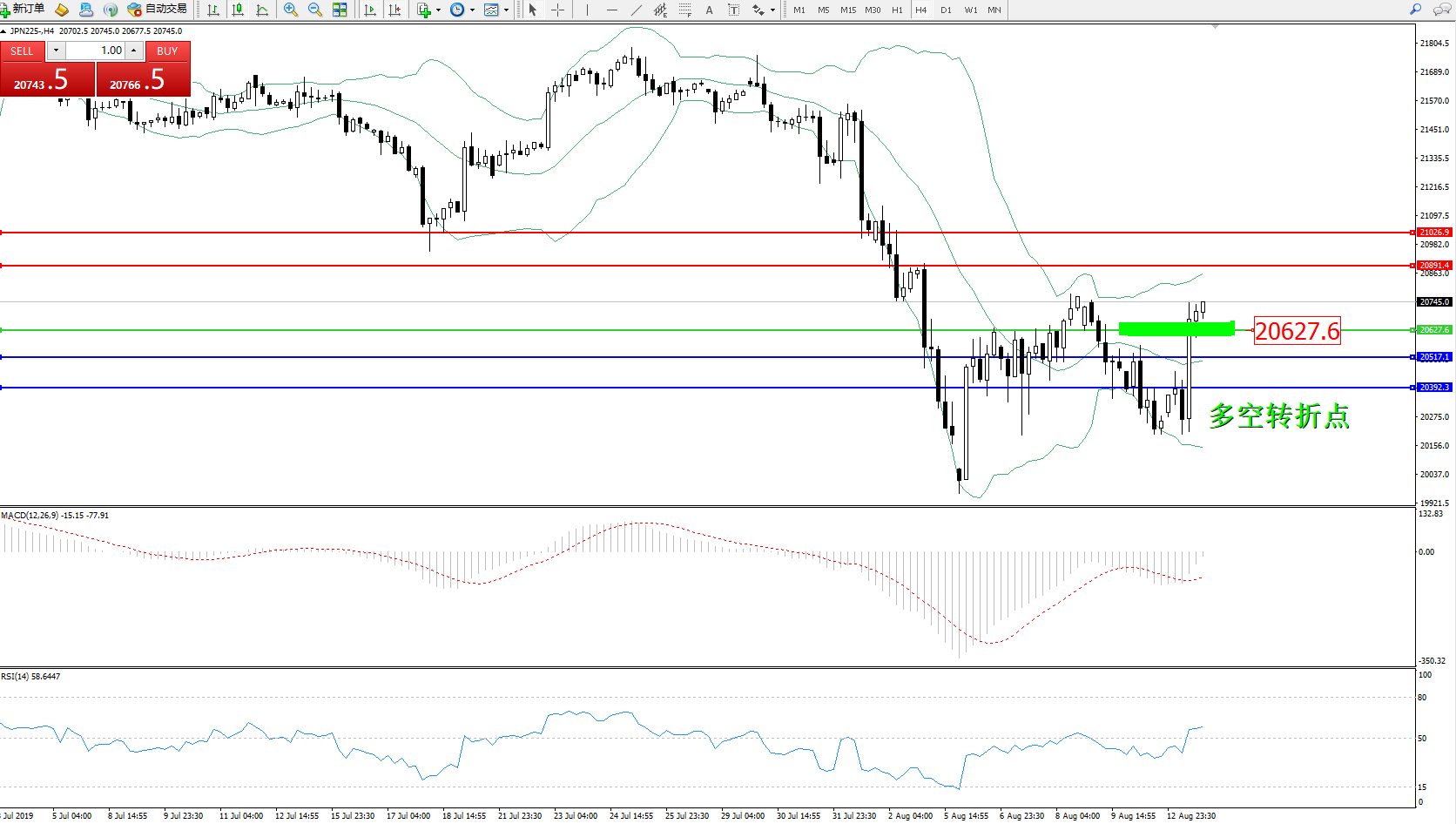 日经225指数8月13日(周二)收盘下跌260.82点,跌幅1.26%,报20424.00点。市场预期旷日持久的贸易争端将对美国经济成长产生负面影响,日经受其影响持续弱势走低,国际商贸与地缘政治局势紧张,10年期美债收益率大幅下跌,令市场担忧美国经济面临衰退风险。隔夜公布美国CPI数据大幅利好,美国联邦基金利率期货显示美联储2019年降息的概率在美国CPI数据公布后下降,提振了美元,