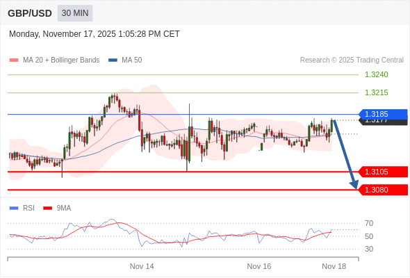 交易策略: 在 1.3185 之下,看跌,目标价位为 1.3105 ,然后为 1.3080 。