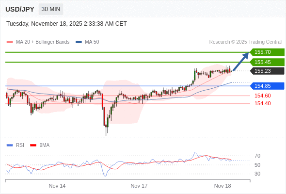 在 154.85 之上,看涨,目标价位为 155.45 ,然后为 155.70 。