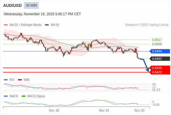 澳元/美元 当日内 : 低于其下布林线