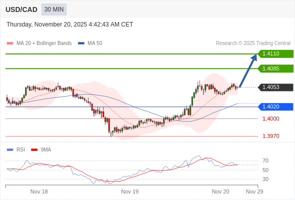 在 1.4020 之上,看涨,目标价位为 1.4085 ,然后为 1.4110 。