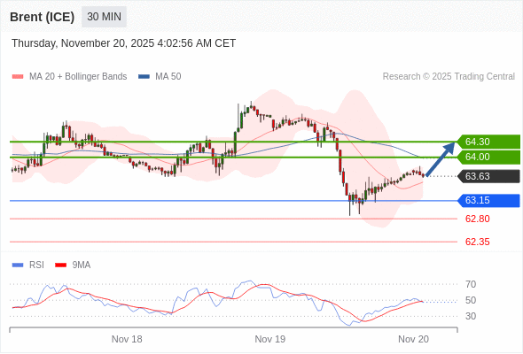 在 63.15 之上,看涨,目标价位为 64.00 ,然后为 64.30 。