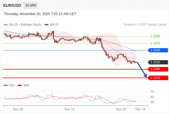 在 1.1550 之下,看跌,目标价位为 1.1495 ,然后为 1.1470 。