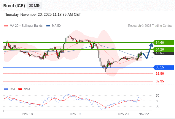 在 63.15 之上,看涨,目标价位为 64.20 ,然后为 64.60 。