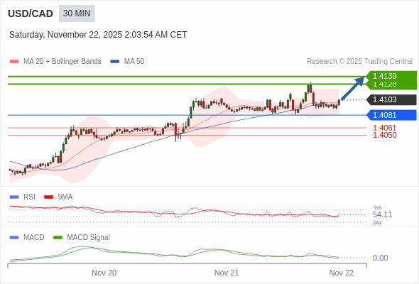 美元/加元 当日内 : 看涨,当 1.4081 为支撑位,目标定在1.4139。