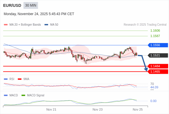欧元/美元 当日内 : 逐渐下跌,当 1.1556 阻碍上行,则 1.1465 为目标位。