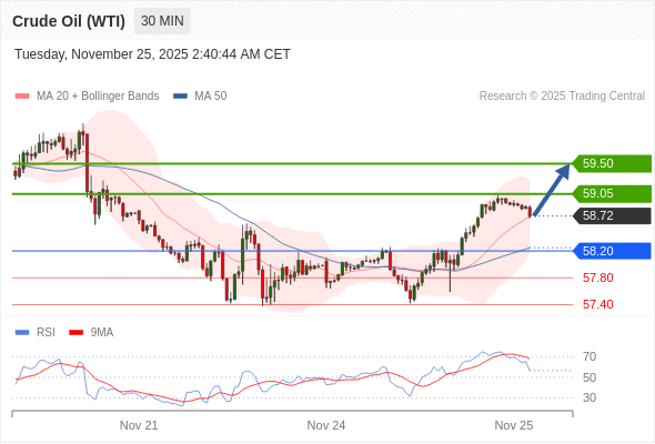 在 58.20 之上,看涨,目标价位为 59.05 ,然后为 59.50 。