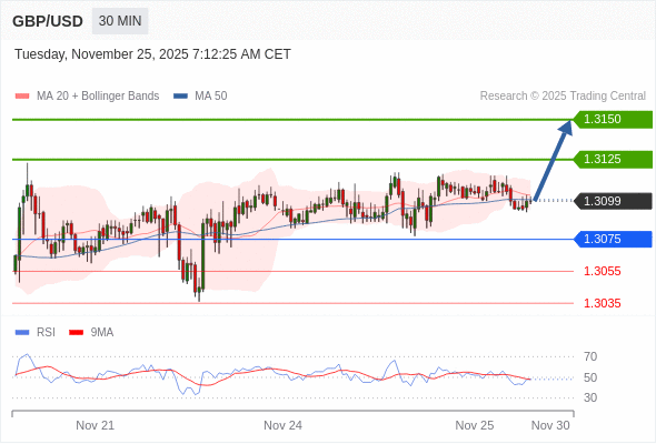 在 1.3075 之上,看涨,目标价位为 1.3125 ,然后为 1.3150 。