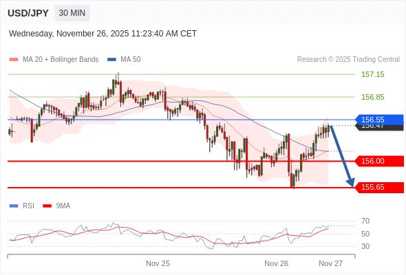 在 156.55 之下,看跌,目标价位为 156.00 ,然后为 155.65 。