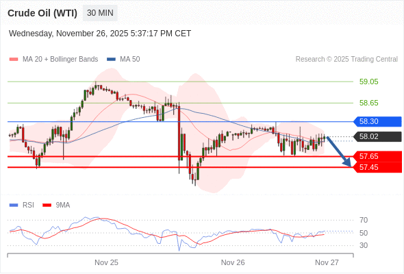 在 58.30 之下,看跌,目标价位为 57.65 ,然后为 57.45 。