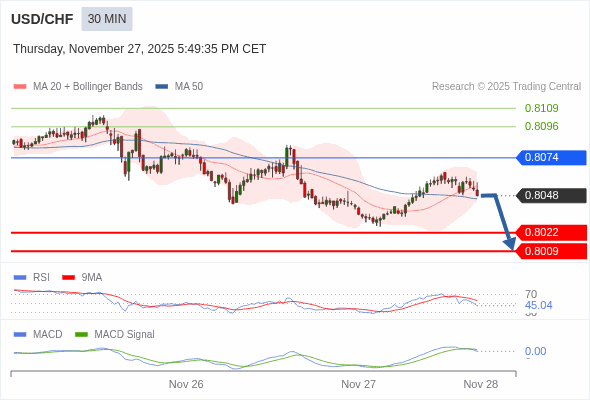 美元/瑞郎 当日内 : 逐渐下跌,当 0.8074 阻碍上行,则 0.8009 为目标位。