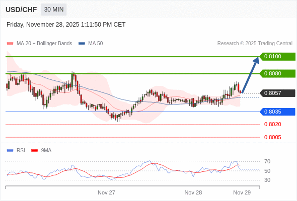 在 0.8035 之上,看涨,目标价位为 0.8080 ,然后为 0.8100 。