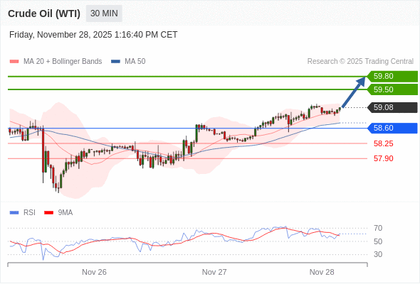 在 58.60 之上,看涨,目标价位为 59.50 ,然后为 59.80 。