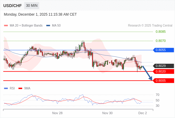 在 0.8055 之下,看跌,目标价位为 0.8020 ,然后为 0.8005 。