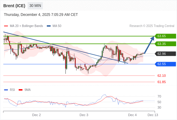 在 62.55 之上,看涨,目标价位为 63.35 ,然后为 63.65 。