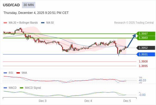 美元/加元 当日内 : 有上涨的可能,目标价位定在 1.3997 。
