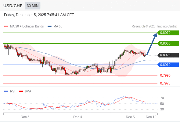 在 0.8010 之上,看涨,目标价位为 0.8050 ,然后为 0.8070 。