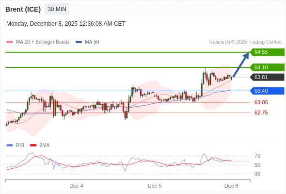 在 63.40 之上,看涨,目标价位为 64.10 ,然后为 64.55 。
