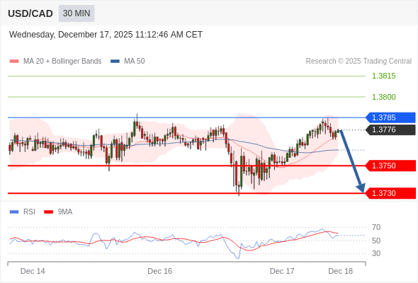 在 1.3785 之下,看跌,目标价位为 1.3750 ,然后为 1.3730 。