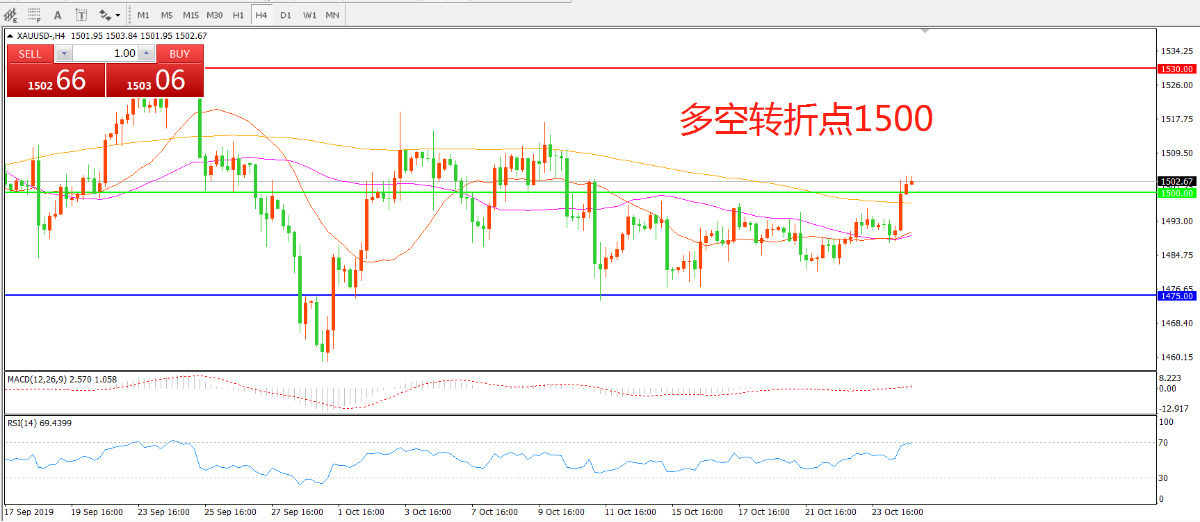 周四(10月24日),欧洲央行行长德拉基在任内最后一次政策讲话中,仍放出鸽派基调,他着重强调经济下行风险,声称如有必要,欧洲央行准备好调整所有政策工具。这给金价带来支撑,日内美国耐用品订单的整体和各分项指标都现出负增长,坐实了美国经济面临的困境,现货金价大幅攀升,收报1503.37美元/盎司。全球经济放缓预期和美联储下周降息预期是对金价走势的有力支撑,下一阶段,重点关注美联储降息预期对市场造成的影响。