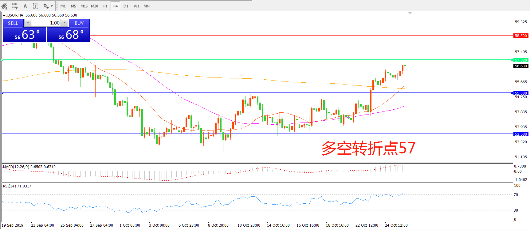 尽管欧美经济数据表现不佳一度曾令油价受到拖累,但EIA原油库存意外下降和国际贸易局势改善给油价提供强劲的上涨动能,美国WTI原油周五(10月25日)收涨0.8%,报56.73美元。录得6月底以来最佳单周表现。美国油服公司贝克休斯周五(10月25日)公布数据显示,截至10月25日当周,美国石油活跃钻井数锐减17座至696座,创4月来最大单周降幅,利好油价。接下来的一周,投资者仍需附国际贸易局势保持密切关注,同时,接下来的一周有众多经济数据,美国三季度GDP数据、美联储利率决议、美国9月份PCE数据和最重磅的美国10月份非农就业报告,务必重点关注。