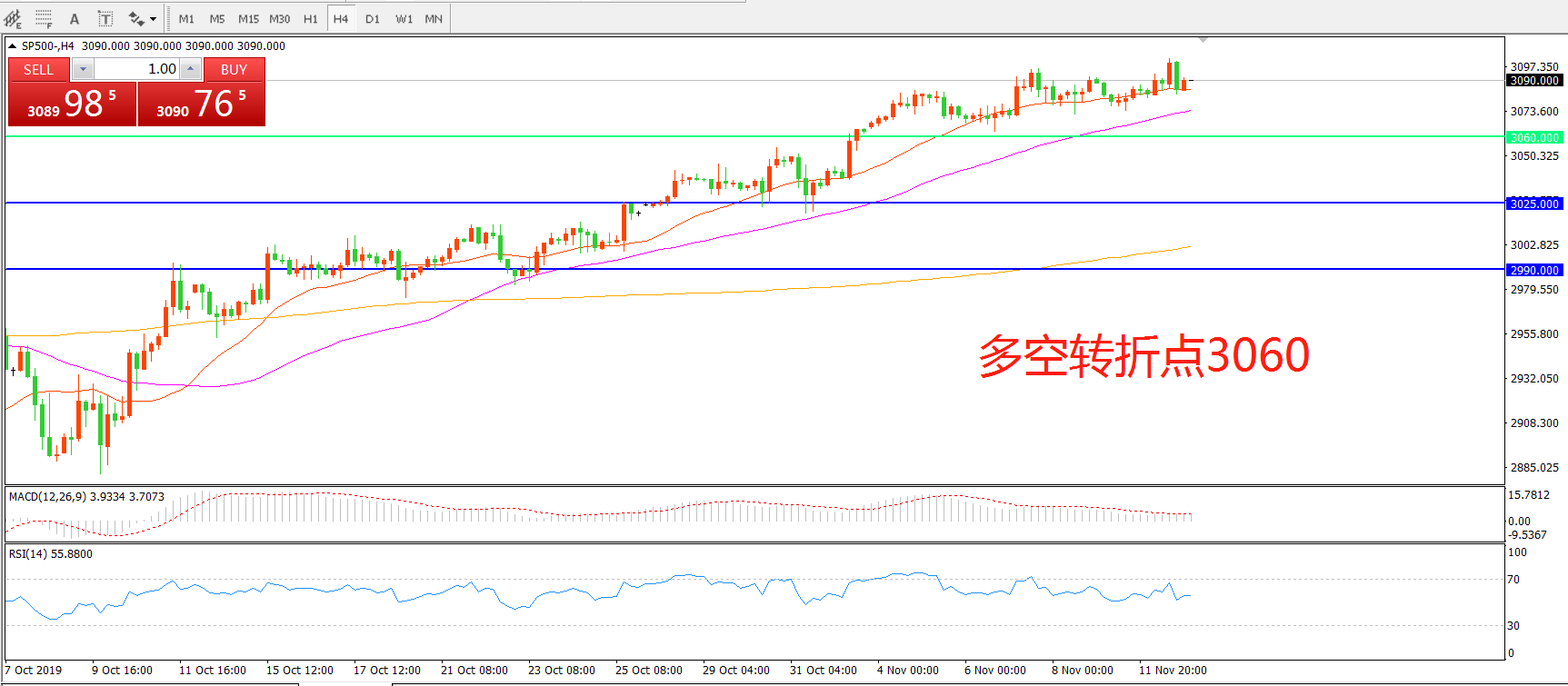 4小时图看,标普500维持震荡上行,整体处于多头趋势,均线系统有走平迹象,MACD红柱减少,RSI指标走平,需警惕短期回落风险。