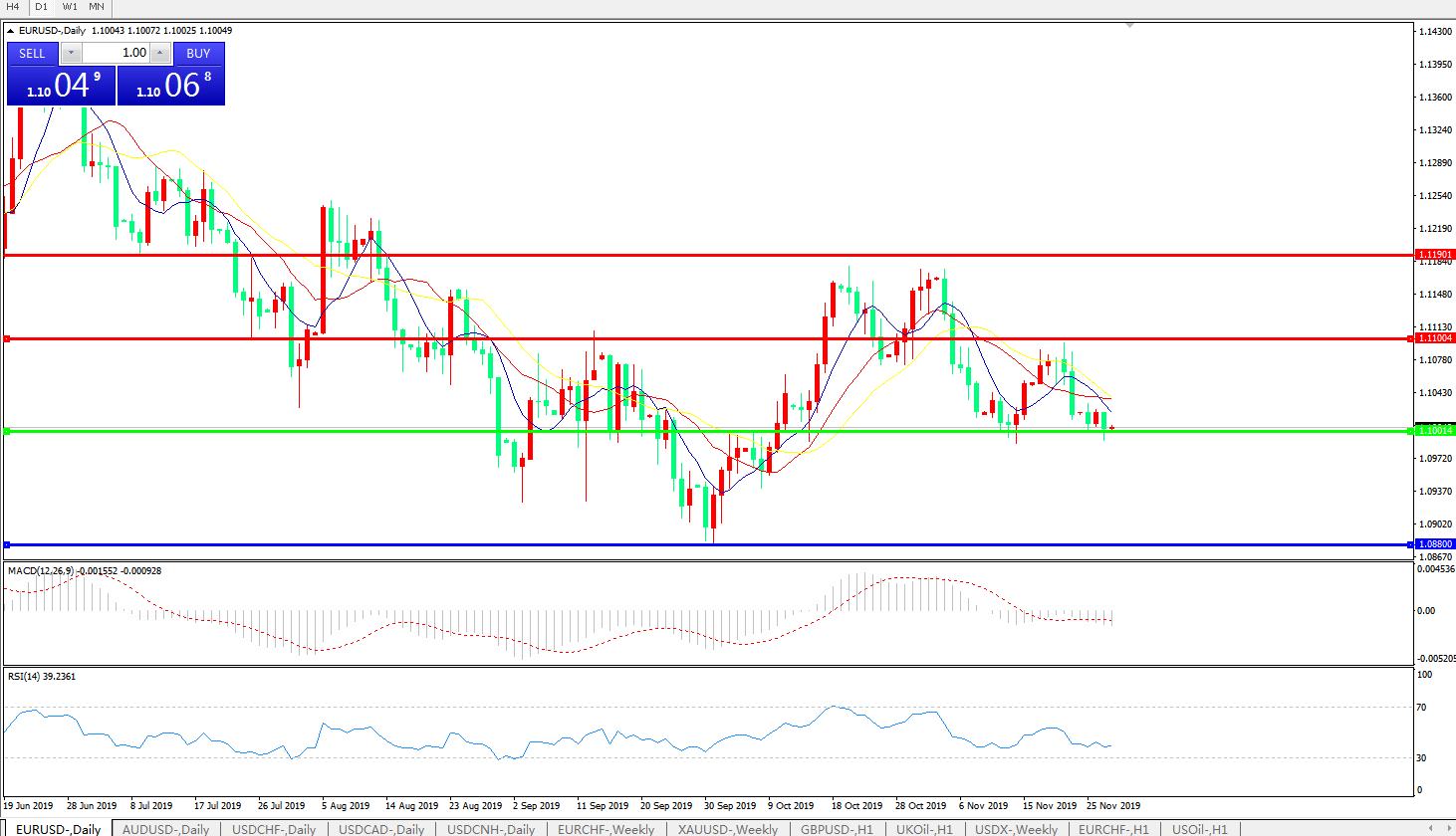 欧元兑美元在周三继续表现低迷,欧市开盘后触及11月14日以来近两周低位1.1003,这使得1.10心理关口也已经危在旦夕。原因在于日内全面贸易向好消息继续推动美元指数走强,令以欧元为首的非美货币承压,而市场对欧元区经济前景也仍存忧虑;此前,欧盟委员会新主席冯德莱恩发表了首秀讲话,其措辞对于欧元区经济看法仍偏于谨慎,并在财政刺激问题上采取回避态度,这也令汇市投资者感到失望。市场同时还担心本周末德国社民党领袖改选所可能带来的连带影响。一旦社民党新领导层撤回对联合政府的支持,该国提前大选的前景将令总理默克尔提早退休,从而令整个欧元区政治经济前景增添更多变数;而眼下,市场首先则更关注美国方面此后发表的多项经济数据。一旦数据显示是经济基本面美强欧弱更加显著,欧元下破1.10将是大势所趋,若前低1.0989也告失守,更大的下行空间就将随即打开