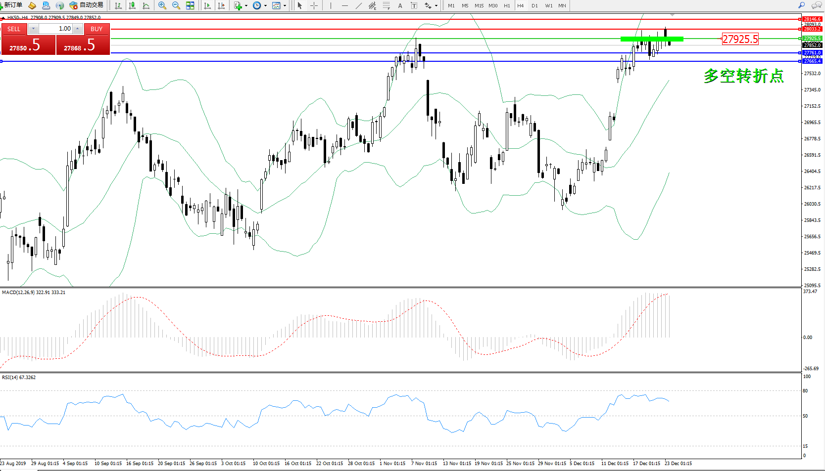 香港恒生指数12月23日(周一)收盘上涨35.06点,涨幅0.13%,报27906.41点;港股跟随外围造好而高开153点,恒指高见28024,直冲上28000关口,但已见是日高位。沽盘即见涌出,恒指先收窄升幅,再回落倒跌41点,低见27830。本周,市场迎来大的假期圣诞节,预计整体会比较清淡。但大基调继续向好。中美首脑通电话,确定第一阶段达成协议,营造了较好的市场氛围。