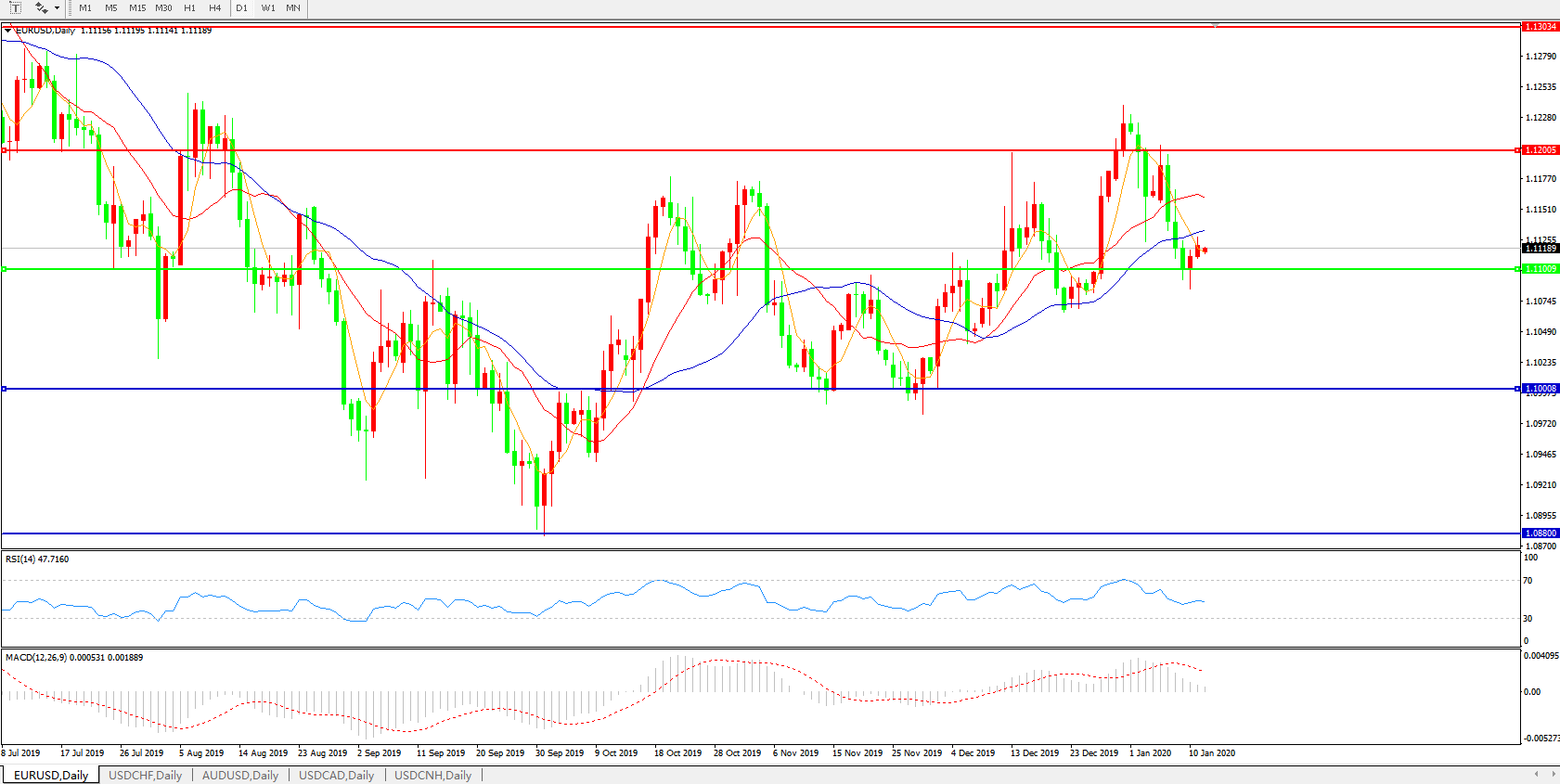 技术面简析:日图短期均线开始形成死叉,汇价近日小幅反弹暂时企稳1.11关口,MACD开始下行且量能快速萎缩 ,RSI缓步走低,预计汇价大概率将弱势整理,重点关注下方1.11关口的支撑。