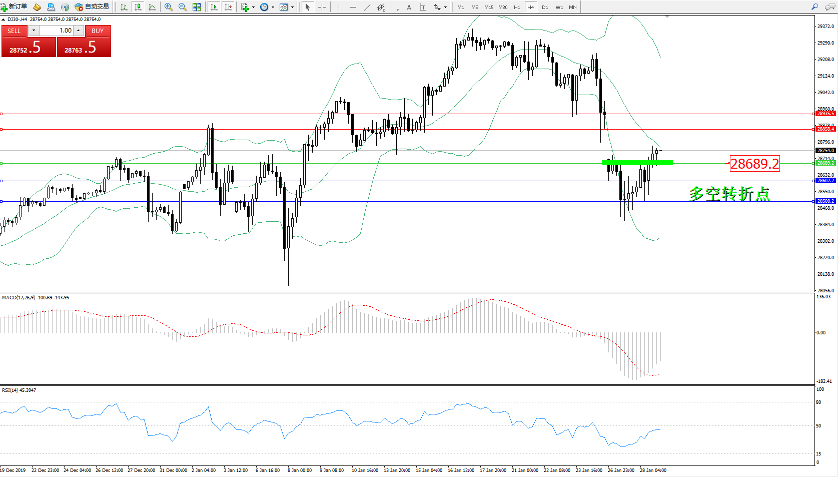 道琼斯指数DJ30—— 4小时K线图显示: