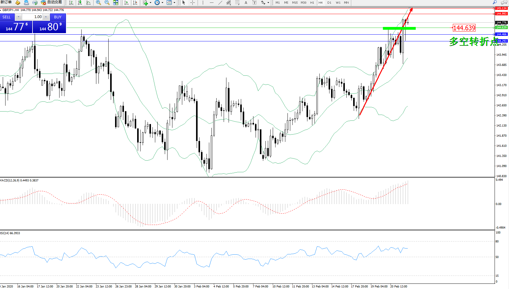 交易策略:144.639上方看涨,目标144.466144.293