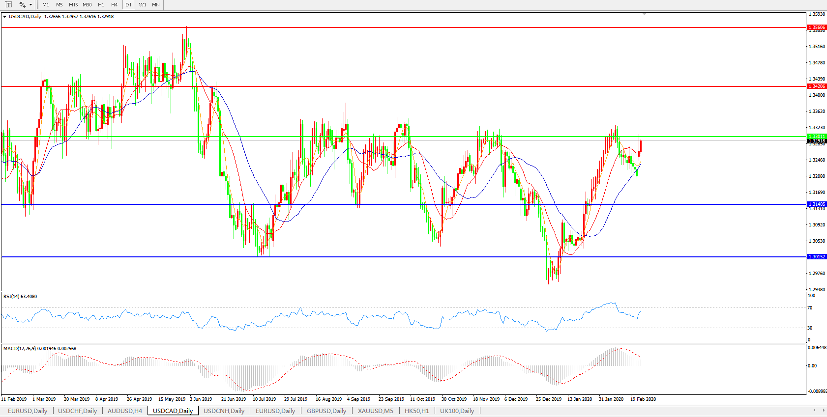周一(2月24日),美元兑加元升至近两周高位1.3307,但汇价在1.33关口附近明显遭遇阻力;汇价上周在200日均线附近获得支撑,因全球公共卫生形势令人不安,油价在本周首日暴跌逾4%,也拖累了加元;事实证明,在全球政经形势恶化之际,美元也表现出部分避险属性,美元指数重新回到5日均线上方;技术上看,美元兑加元面临前期颈线位——2月10日高点1.3329阻力;若汇价能成功站上该价位,方能确立新的涨势。