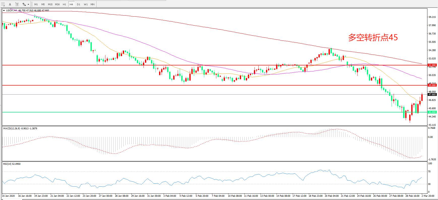 周一(3月2日),美国总统特朗普发推称,美联储主席鲍威尔与美联储的反应迟缓,美国应当拥有最低的利率水平,而日本央行行长黑田东彦发表了一份紧急声明,明确表示将采取必要举措来“稳定金融市场”。全球央行或将再次联手救市的预期提振了市场上的风险情绪,美国WTI原油大幅反弹,收报47.49美元/桶。