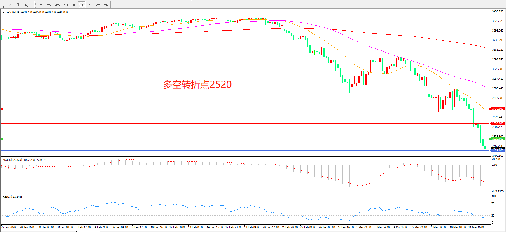 4小时图看,标普500连续下行,整体表现偏空,均线系统呈空头排列,MACD绿柱增加,RSI指标走平,中期走势依然偏空。