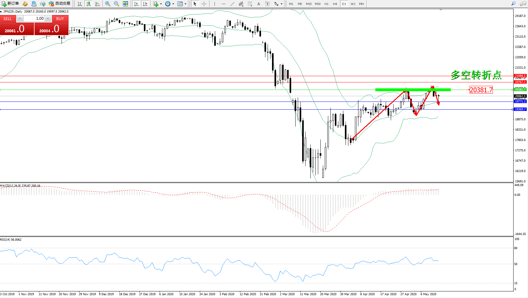 日经225指数5月14日(周四)收盘下跌361.55点,跌幅1.78%,报19905.50点。日本央行行长黑田东彦:日本经济受到疫情的严重冲击,预计日本经济将萎缩,今年一二季严重受抑,一旦疫情得到控制,日本经济将在今年下半年复苏,日本央行将购买不限数量的日本国债以控制收益率,收益率曲线控制令政策组合更有效,本央行将在必要时增加宽松政策;如果需要,日本央行还有许多工具和措施可进行部署;日本央行政策已经对经济产生一些影响,经济活动可能在2020年下半年重启。根据收益率曲线控制政策,我们将购买任何数量的日债来维持10年债收益率在零附近,这会自动增强财政和货币政策的协调,日本央行可能必须在未来几年继续实施宽松政策,在病毒爆发后,额外的措施将逐步减少,当前实施的非常规的新冠肺炎措施是暂时的,预计不会很快实现2%的通胀目标。