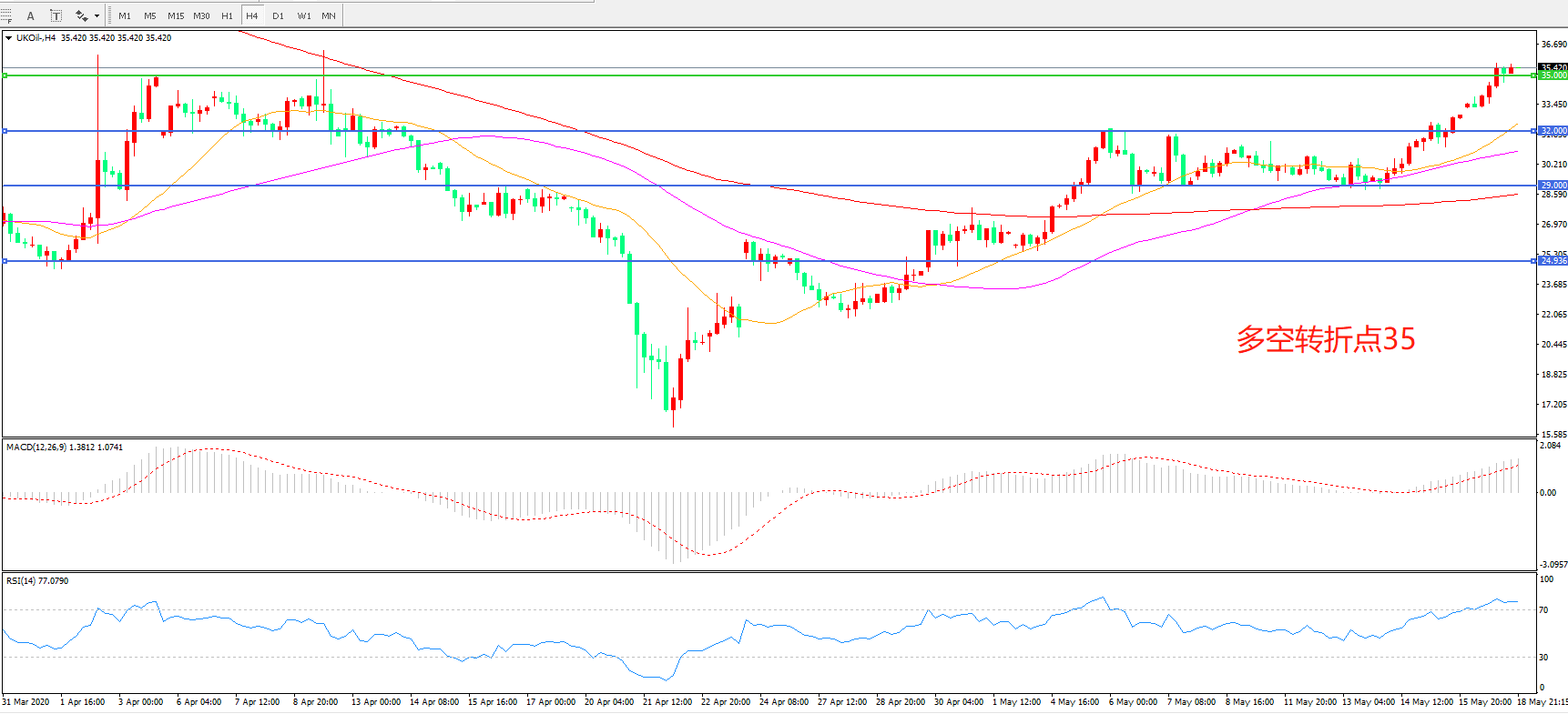 周一(5月18日),受需求改善和疫苗研发利好刺激,布伦特原油大幅拉升,收报35.42美元/桶,创下两月以来最高收盘价。随着OPEC和其他主要产油国同意减产970万桶/日,市场风险情绪大幅改善,尤其疫苗研发领域也传来重大利好时,多头信心受到鼓舞。