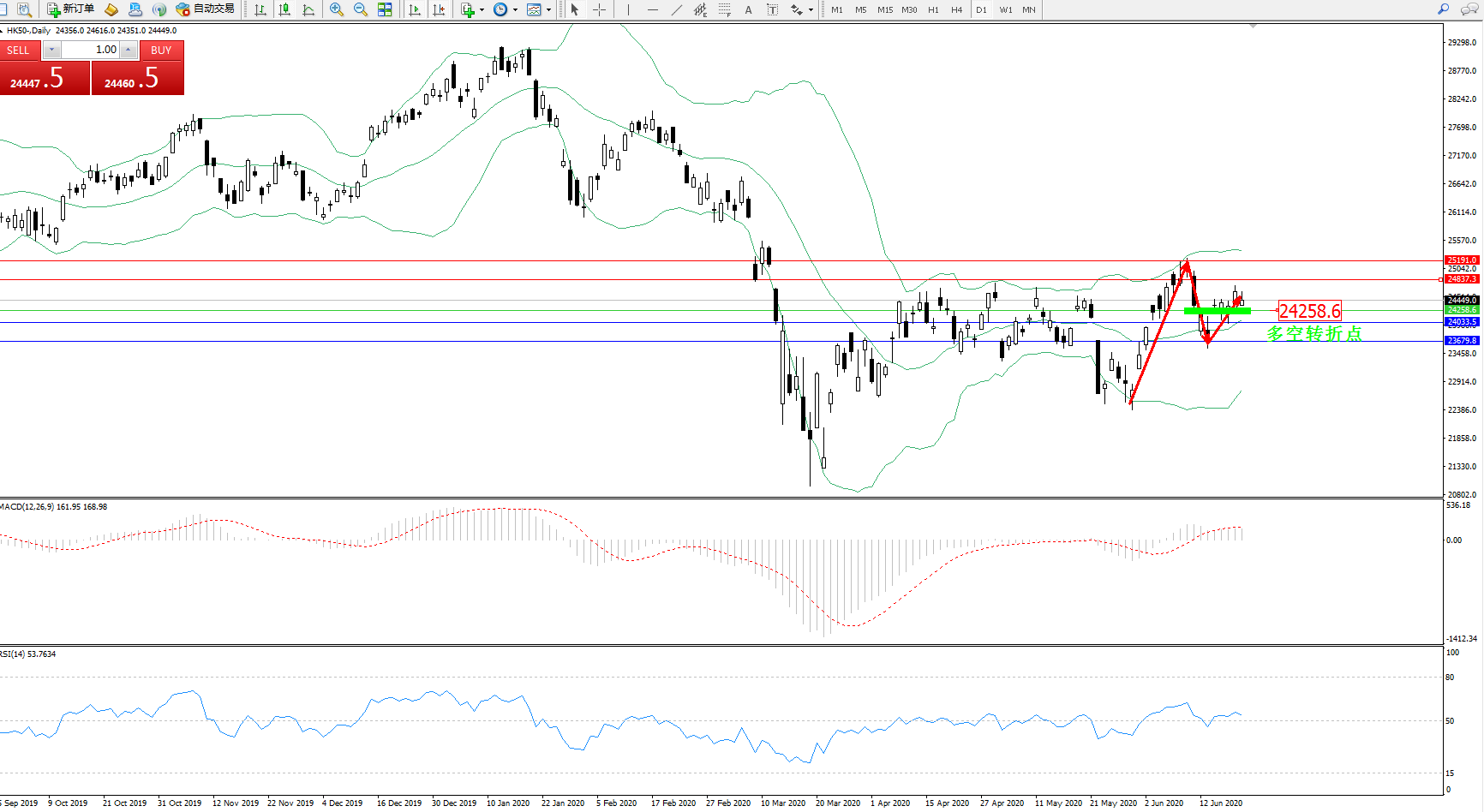 香港恒生指数6月22日(周一)收盘下跌132.55点,跌幅0.54%,报24511.34点;港股三大指数全日震荡收跌,国指跌0.96%报9879点。南下资金净流入21.73亿港元,大市成交额为1195.81亿港元。半导体全日强势领涨,中芯国际大涨近6%逼近新高;生物医药B类股、手游股午后崛起,信达生物大涨超8%续创新高;腾讯与港交所力撑大市,且双双创下新高,分别大涨3%和3.7%,贡献恒指130点。林郑月娥在“2020财新夏季峰会”上表示,未来一年,香港特区政府会加强推动建立跨境理财通机制,扩大香港居民异地见证开立内地个人银行结算账户的试点范围,推动交易所交易基金ETF纳入深港通等政策。
