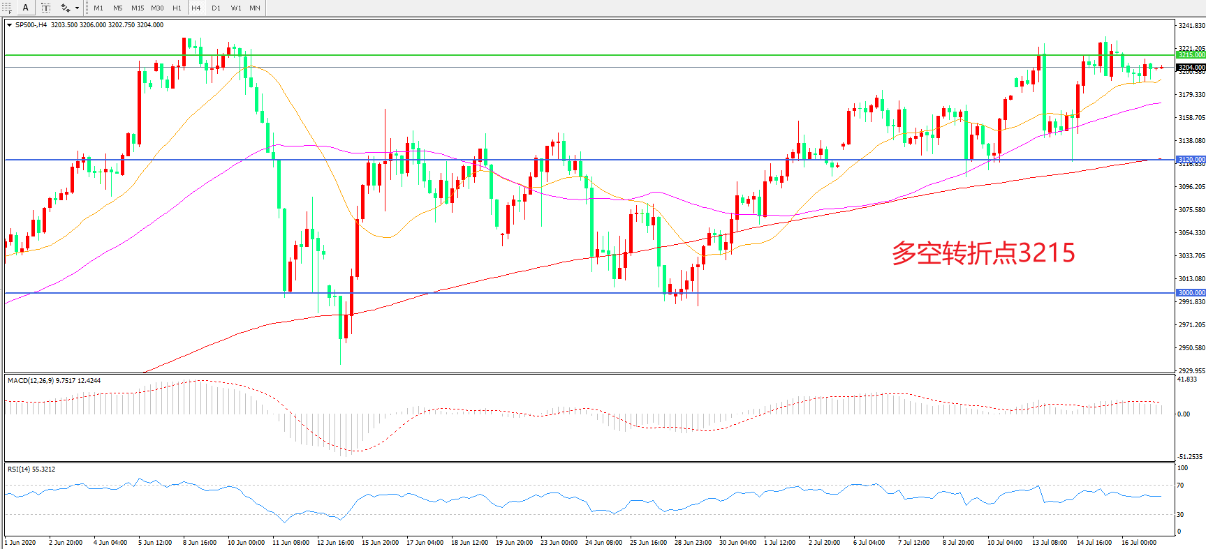 4小时图看,标普500延续高位震荡,短期涨势暂缓,均线系统呈多头排列, MACD红柱减少,RSI指标走平,日内延续震荡概率较大。