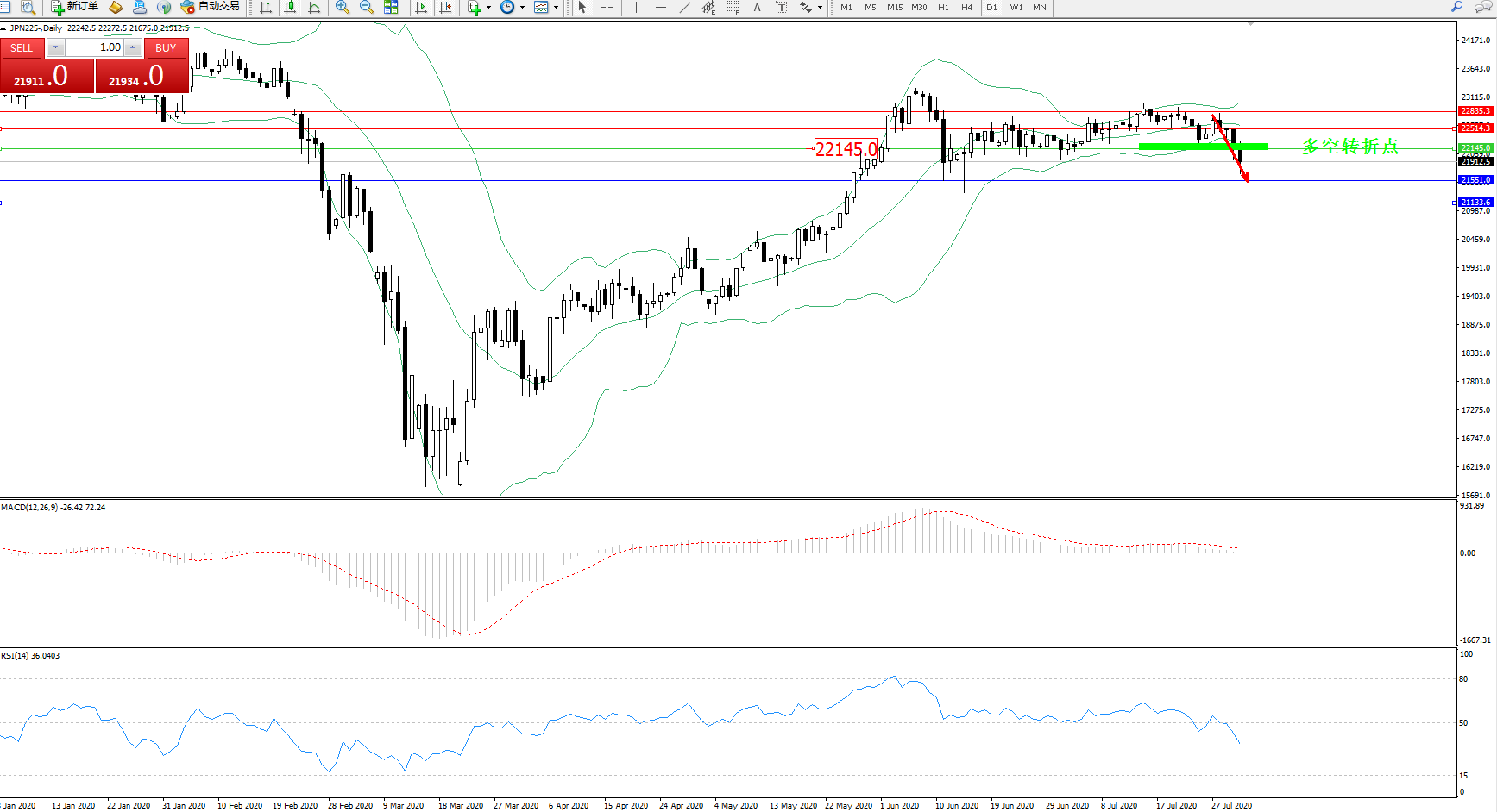日经225指数7月31日(周五)收盘下跌626.73点,跌幅2.81%,报21712.50点。全球疫情近期进一步抬头,导致多国重启或强化隔离措施,对跨境旅行更是设置了更多限制,导致民众出行需求再受打击,而由此带来的经济不振前景则是额外的压力。日本央行官员称对汇率水平“拒绝置评”,这令投资者进一步相信日本央行近期不会因为日元汇率走高而采取干预措施;隔夜美国GDP创下历史最大降幅,市场同时更开始更多顾虑起美国大选的不确定性前景和财政政策的潜在变动,这令避险资金从美元资产流出,日本政府30日召开专家等组成的研究会,认定第二届安倍政府上台的2012年12月开始的经济扩张期在2018年10月结束,并在次月11月进入衰退阶段。持续时间为71个月,未及“伊奘冉景气”(2002年2月至2008年2月)73个月的战后最长纪录。