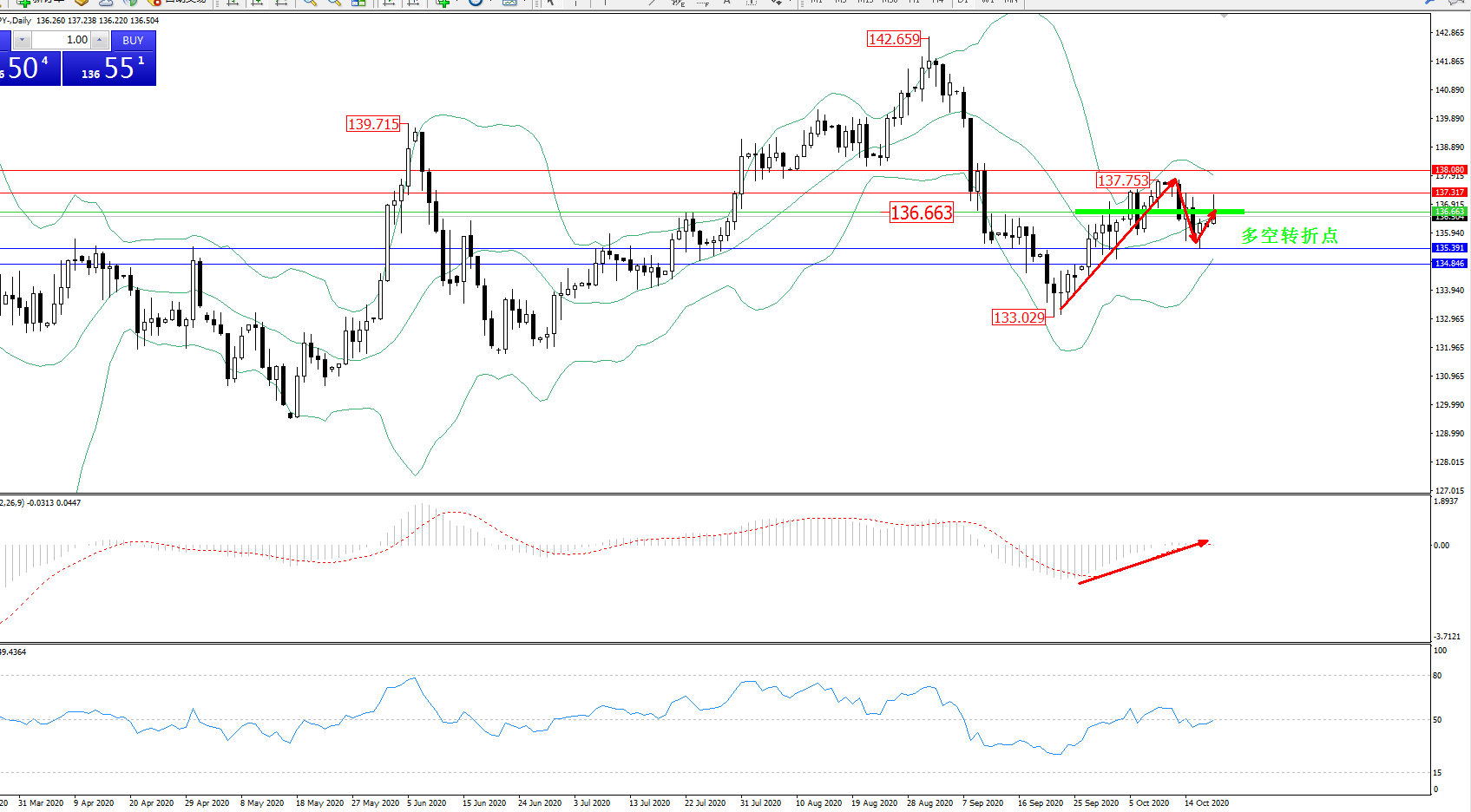 技术点评:低位多头动力持续震荡上扬至137.753位置附近后遇阻,开始震荡回撤,处于中上轨区间高位下行,纠结于中轨附近持续徘徊中,有继续向下移动态势,布林带指标呈收口走势中,MACD指标处于空头区域低位整理回升至0轴线附近弱势徘徊中,RSI指标低位多头动力整理回升至50均衡线后持持续整理平移迹象;