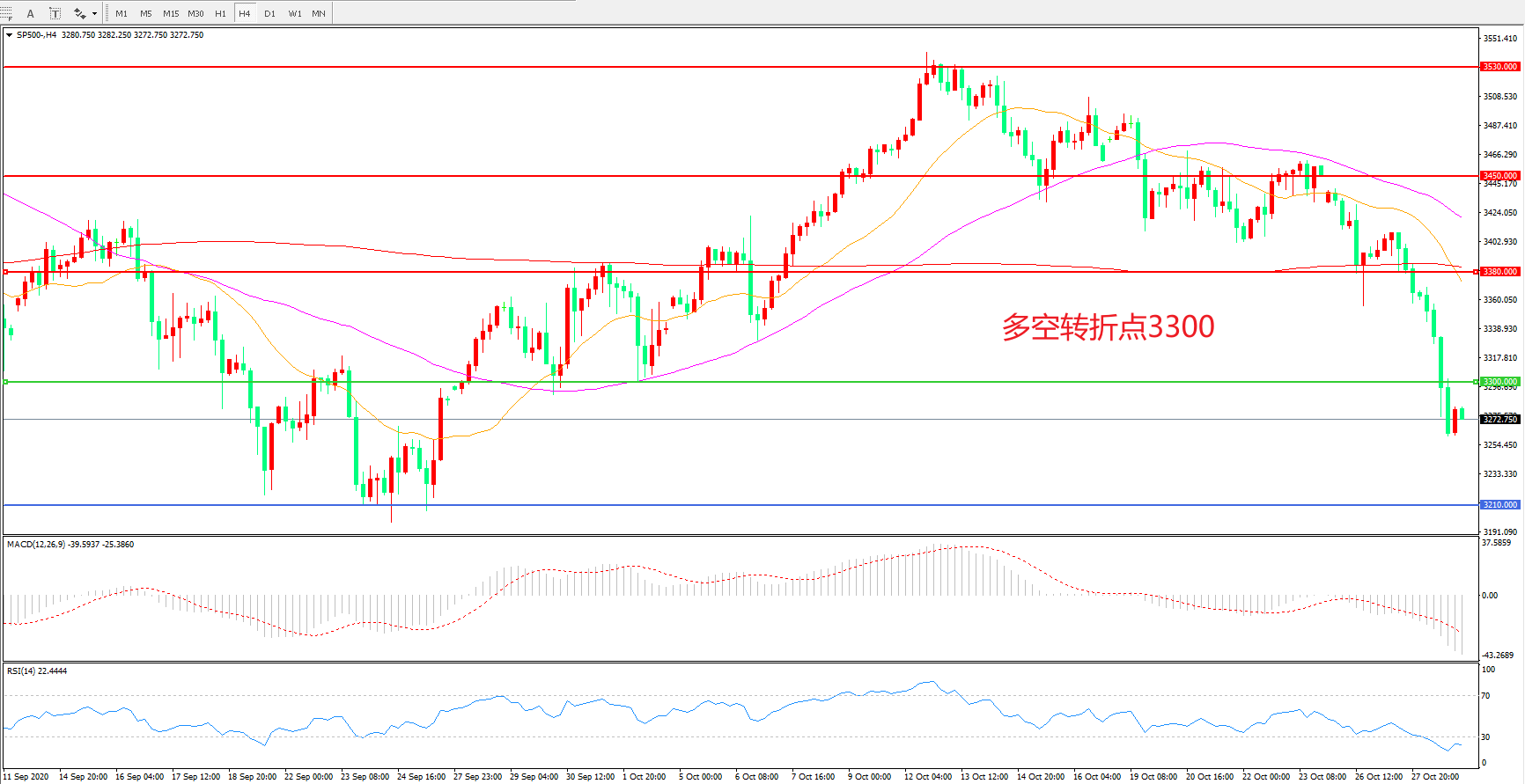 周三(10月28日),在欧美新增病例处于高位之时,欧洲两大经济体德国和法国加强了防疫封锁,美国几无可能在大选前推出新刺,市场对疫情破坏经济复苏的担忧加剧,欧美股市全线崩盘,标普500大幅下挫后收报3278.50点,日内跌幅接近3.6%,大型科技股中,Facebook和谷歌均跌超5%,苹果跌超4%。